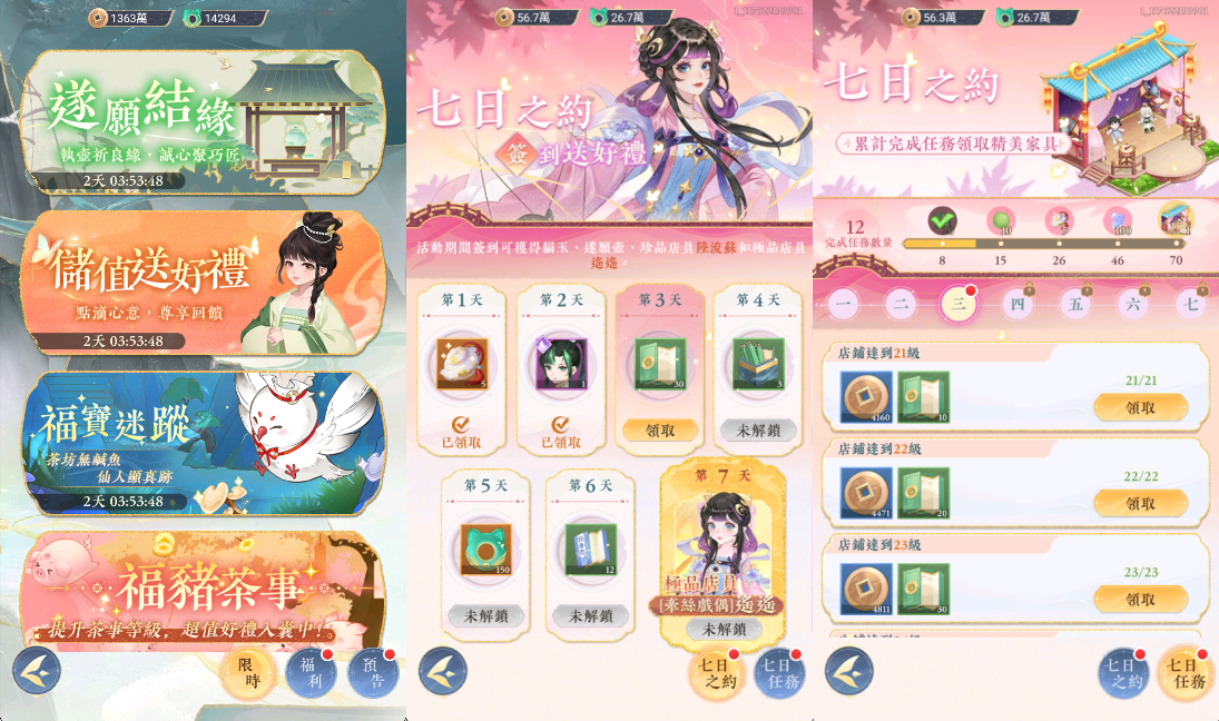 遊戲將於今日上線,除了可以領取到事前預約福利的晉升簡書X100、貓玉X100、遂願壺X3和限定頭像框X1外,還有7日登入領取極品店員遙遙和珍品店員陸流蘇,以及各項資源獎勵。遙遙能增加我方廚藝、增加客流量,自身也有高速移動技能,好應對不斷進店的人潮,是初始不錯的店員考量。玩家也可以透過七日之約的任務活動獲得豐富資源,累積完成還能領取傀戲開幕的精美家俱。