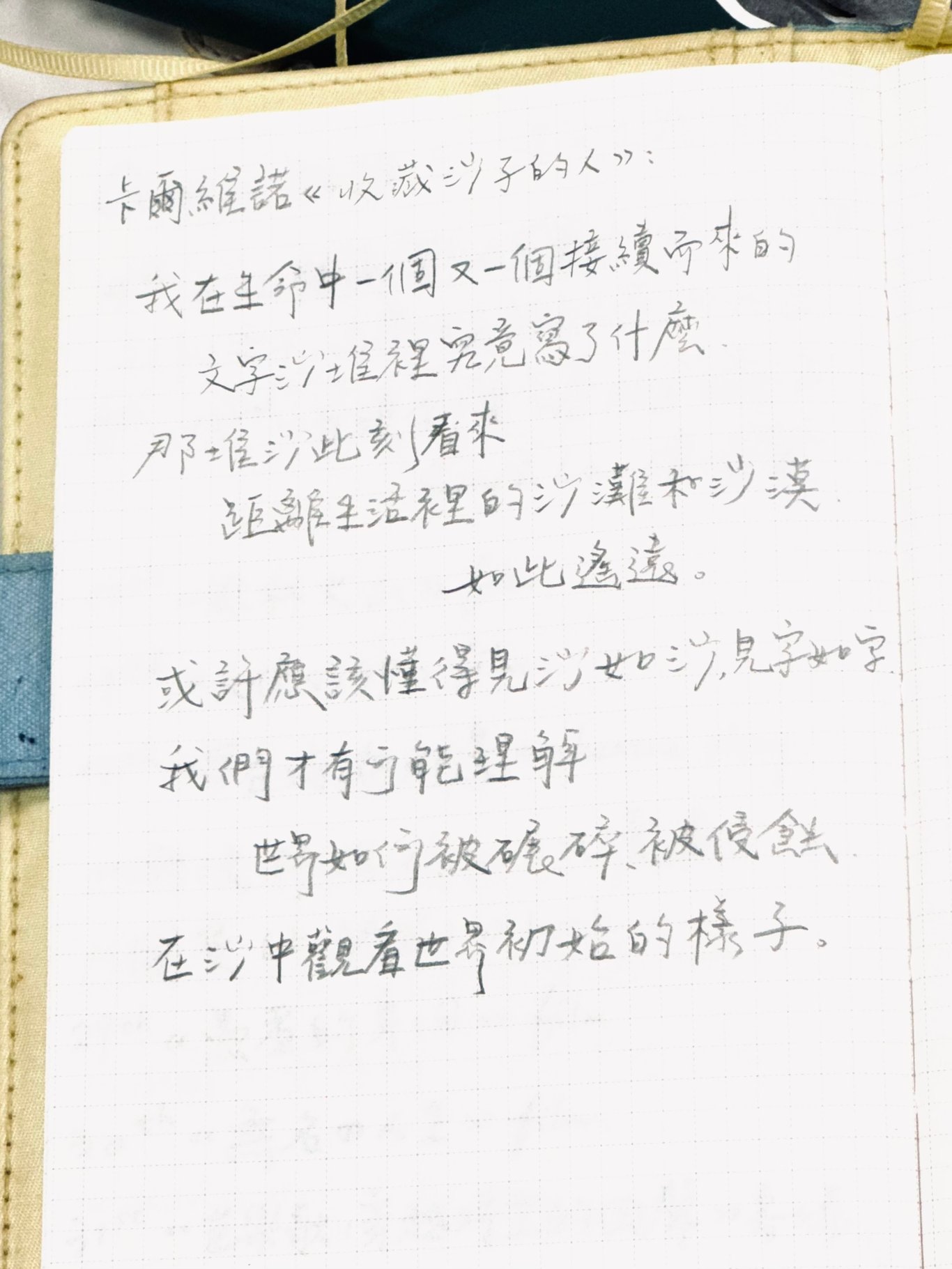 至於那些不能(或尚未等到時機)被宣表的事件,失去與獲得,我們都把它們記錄下來吧。照片或文字都好,總之,我們不要用疲累去損耗那些複雜、應當被沉澱的心焦,我們讓它們用具體的形式,留存在我們的生命裡吧——這是我今年讀了《吹上奇譚(吉本芭娜娜)》和《收藏沙子的人(伊塔羅·卡爾維諾)》後的心得,確切段落放在附圖——作為給未來的自己的救贖,也作為學習樣本,讓我們接近理解,這個世界如何被碾碎、被侵蝕。