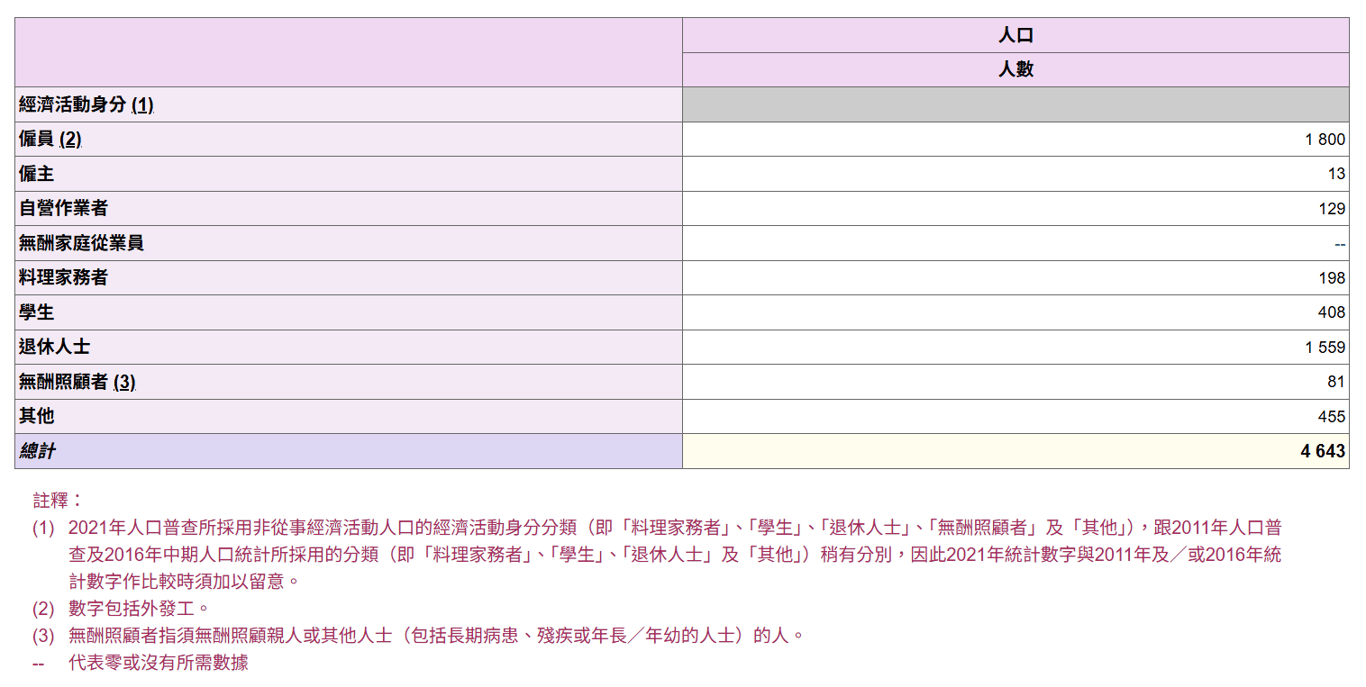 該年齡段處於「上班族」和「長者」之間的中間過渡期,自由度較高,部分可能已提早退休、兼職、或從事靈活性工作,亦可能在家照顧孩子/老人/做家務/打麻將。上文所示的人口普查數據表格截圖中提到的料理家務者(198人)和無酬照顧者(81人)也主要集中在該年齡段。