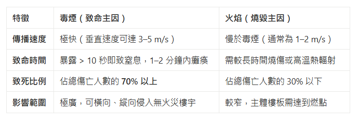 疑點二:E座(82死)與 F座(70死)承受了毀滅性打擊,但與其緊鄰且同樣被棚網包裹的 A、B、C、D、G 座,死亡數字卻呈現斷崖式下跌(分別為 0、2、3、0、1)。我們已知宏福苑火災的特徵是「七座連環燒」, 7 座樓宇(A至G座)是被同一套棚網包裹的,全屋苑的棚網和發泡膠等物料都是不阻燃的。火災發生時,外部連通的易燃棚網是導火索,會引發「橫向蔓延」。如果 E、F 座火勢大到能造成 152 人死亡,其產生的高溫濃煙和飛火必然會引燃相連樓宇的棚架。若在飛火較小的情況下,火災產生的高溫高濃度的劇毒濃煙(CO, HCN)也會順著風向、亂流和棚架通道,橫向侵入相鄰樓宇,火場中 70%以上的死者是因吸入濃煙致死,而非被火燒死。即便 A、B、C、D 座未發生主體燃燒,只要濃煙灌入,在長者佔比極高(約40%)的宏福苑,必然會造成大量靜態窒息死亡。所以,官方這種「兩棟樓屠殺,五棟樓平安」的極端兩極化死亡分佈,是明顯不符合氣體擴散定律的,也與真實火勢完全不對稱。