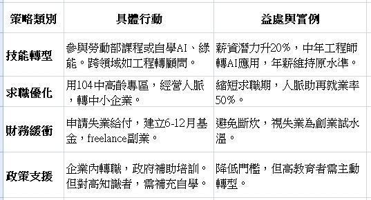 中年失業多因企業成本考量或AI取代。台灣勞動部「中高齡者及高齡者就業促進計畫(2023-2025年)」整合10部會資源,提供僱用獎助(最高18萬元)、續僱補助(最高25.8萬元)、職務再設計(每年最高10萬元),並分齡策略:45-54歲僱用獎助;55-64歲延緩退休;65歲以上鼓勵活躍老化。 但這些計畫多聚集在勞動密集產業(如製造業、服務業),對高教育、高知識人群(如工程師、管理者)幫助有限,因為缺乏針對專業轉型的深度培訓。