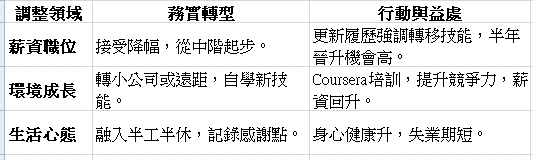 失業後,重返需調整期待:薪資降10-20%常見,但聚焦總價值與小公司機會。 認清不易回大公司,轉向小公司的靈活邏輯,能延續職涯至退休。