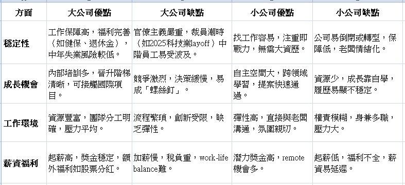 選擇時,評估個人風險偏好:若討厭官僚,選小公司;但中年後,想回大公司難度高,因為它們的招聘邏輯更注重系統化經驗。建議年輕時在小公司累積多樣技能,為未來轉型鋪路。