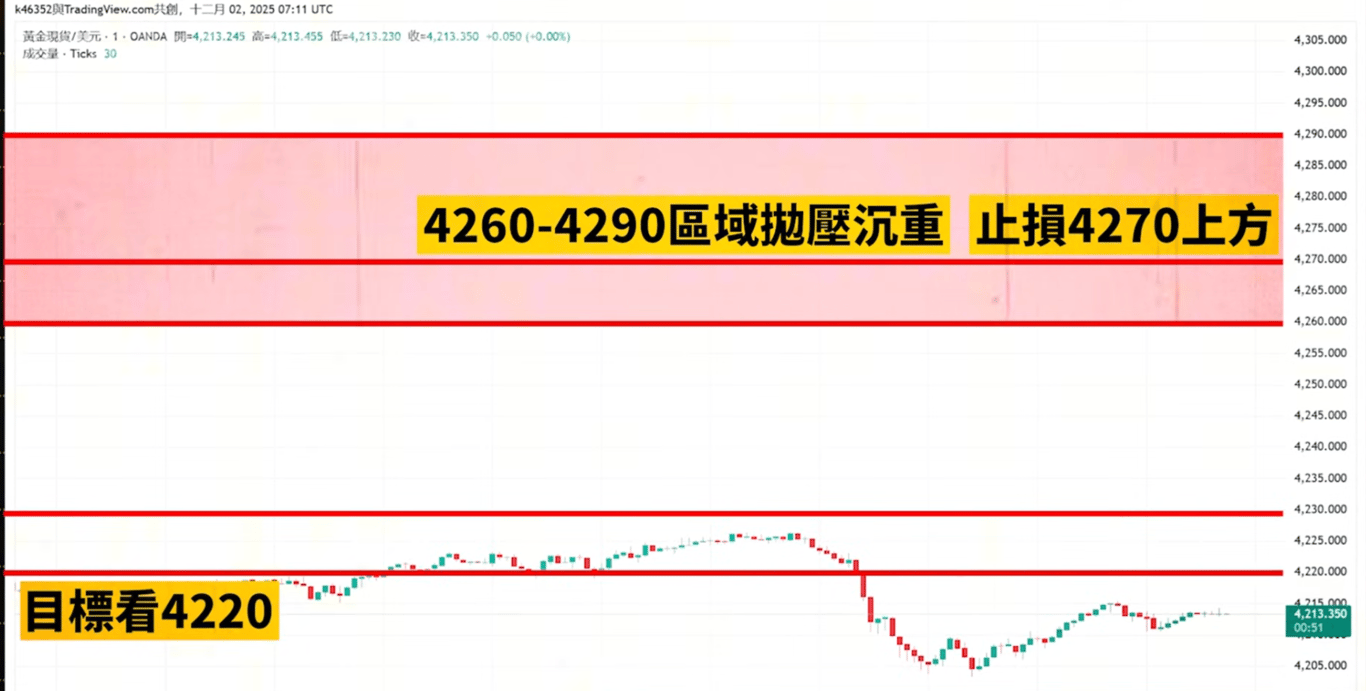 操作上,若在4250附近明顯受阻,可輕倉試空,停損4270上方,目標看4220、4200。重點來了!如果價格回落到 4200-4210強支撐區並出現停跌訊號,那就是絕佳的低吸機會,停損設4170下方,目標看回4220。