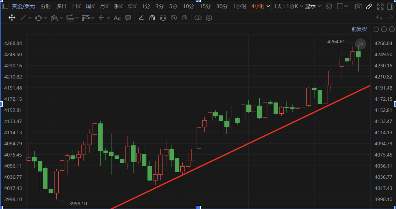 朋友們,12月1號晚上那波行情,有沒有看得你們心跳加速,手心冒汗?黃金價格就像個喝醉了酒的西部槍手,晃晃悠悠地往上沖,到了4265美元這個關口,又被一股神秘力量給推了回來,最終收在4232美元,留下了一根長長的上影線!