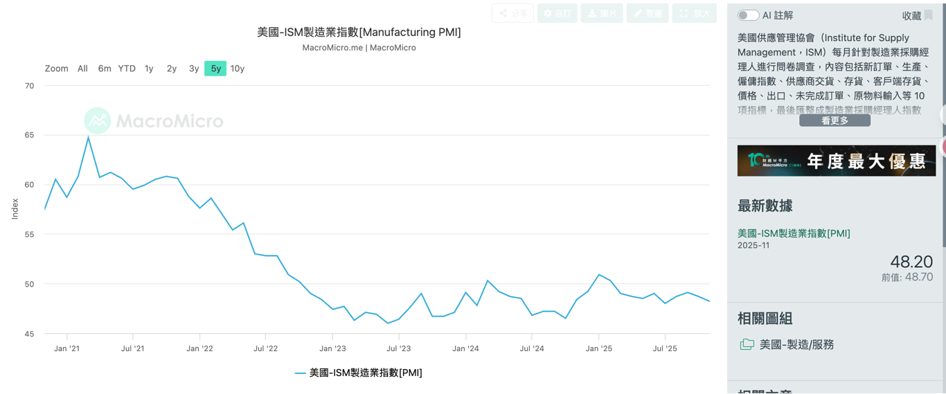 昨天,這燃料可是加得足足的,昨天的重頭戲,就是美國11月的ISM製造業PMI數據。朋友們,這個數據可以看作是製造業的體檢報告。結果怎麼樣?實際值48.2,不僅低於預期的48.8,更重要的是,它已經連續9個月低於50的榮枯線了!這意味著美國的製造業一直在收縮,處於生病狀態。更嚇人的是裡面的就業分項數據,只有44.0,遠低於預期,表示工廠在加速裁員!
