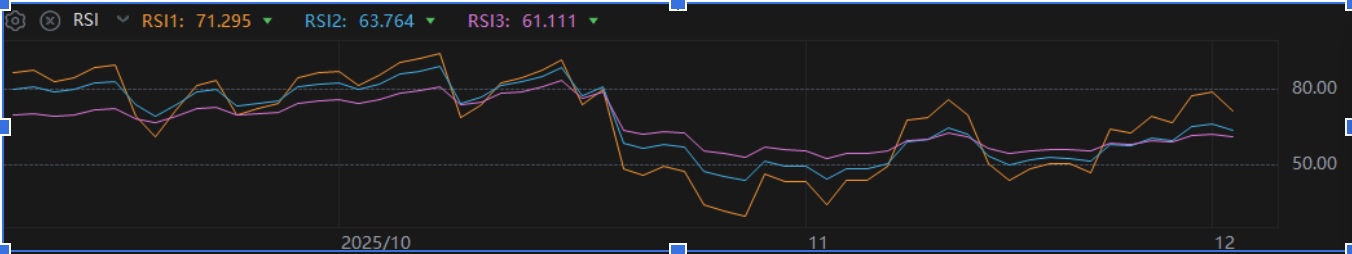 首先RSI(相對強弱指數),目前大概在52-55這個區域,朋友們,這說明了什麼?這說明市場情緒既不是極度狂熱,也不是極度悲觀,處於一個健康的中性偏態狀態。這意味著多頭還有餘力,但如果RSI衝到70以上,我們就要警惕短期回檔的風險了。