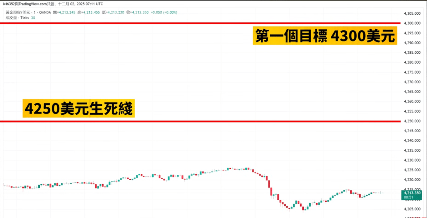 這齣戲很簡單,多頭積蓄力量,配合利空經濟數據,一舉放量衝破4,250美元的生死線。關鍵訊號就是一根放量長陽線站穩這個位置。一旦有效突破,上行空間打開,第一個目標就是 4300美元,甚至歷史新高。