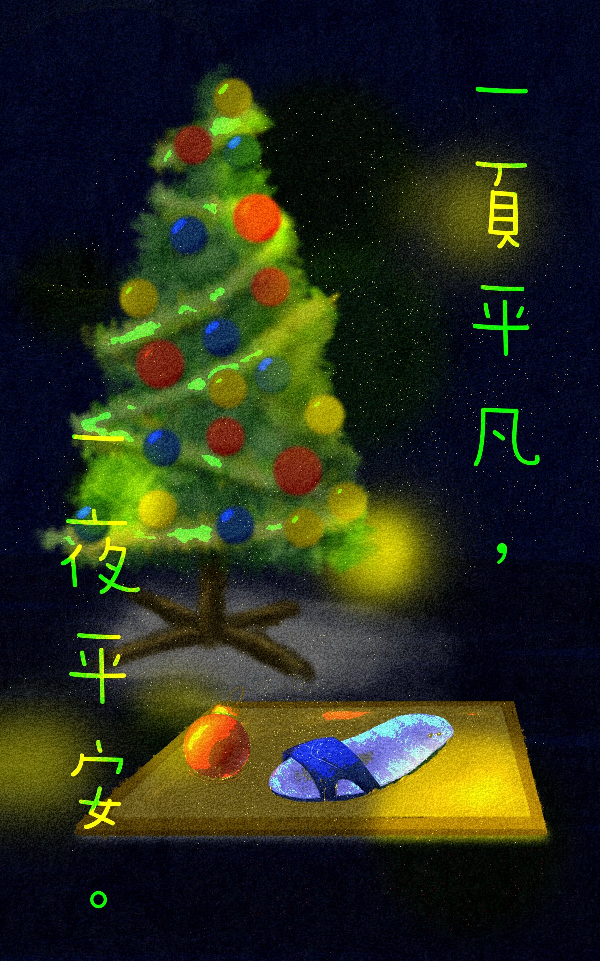 夜深人靜,沒有車輛的喧囂,野貓、野狗似乎也都沉睡,牆上掛鐘,每秒都像轉開的門鎖響著,老爸在床上震耳欲聾的鼾聲,孩子卻在門邊屏息以待,盯著…又盯著那顆沒有燈光裝飾的耶誕樹……