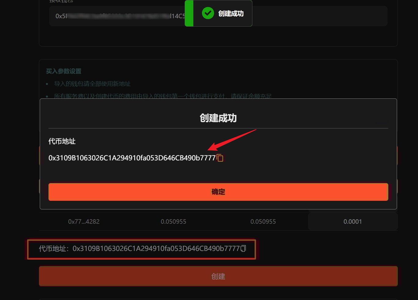 点击“创建”,等待一会。创建成功后,会有弹窗显示代币地址。下方也会显示代币地址,可点击下方的代币地址查看代币信息。