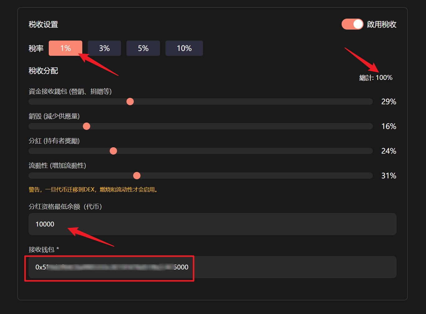 税收分配总计要为100%,可设置分红最低余额以及接收钱包。