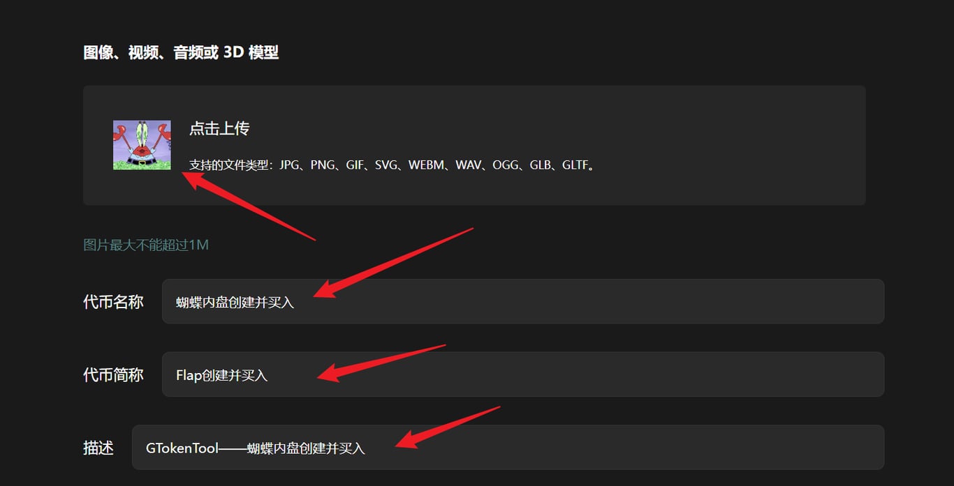 假设我们创建一个代币名称为”蝴蝶内盘创建并买入”的代币,填写信息如下: