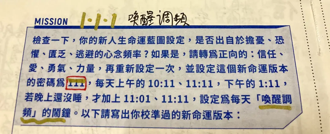 如果是,請轉為正向的:信任、勇氣、力量,再重新設定一次,並設定這個新命運版本密碼為「111」,每天上午的10:11、11:11,下午的1:11,若晚上還沒睡,才加上11:01、11:11,設定為每天「喚醒調頻」的鬧鐘。