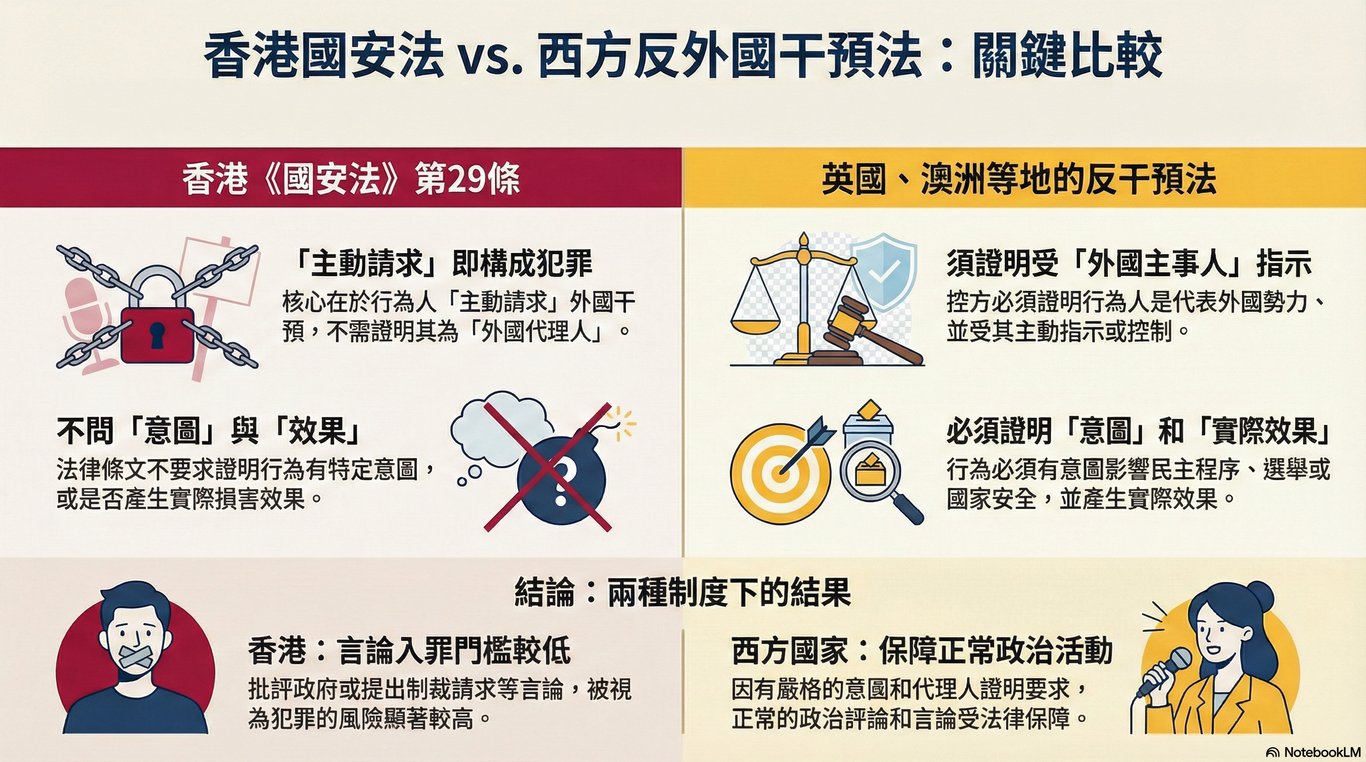 來源指出,香港《國安法》在處理「外國干預」相關罪名時,其法律邏輯與傳統普通常法地區(如英國、澳洲、歐洲)有極大差異: