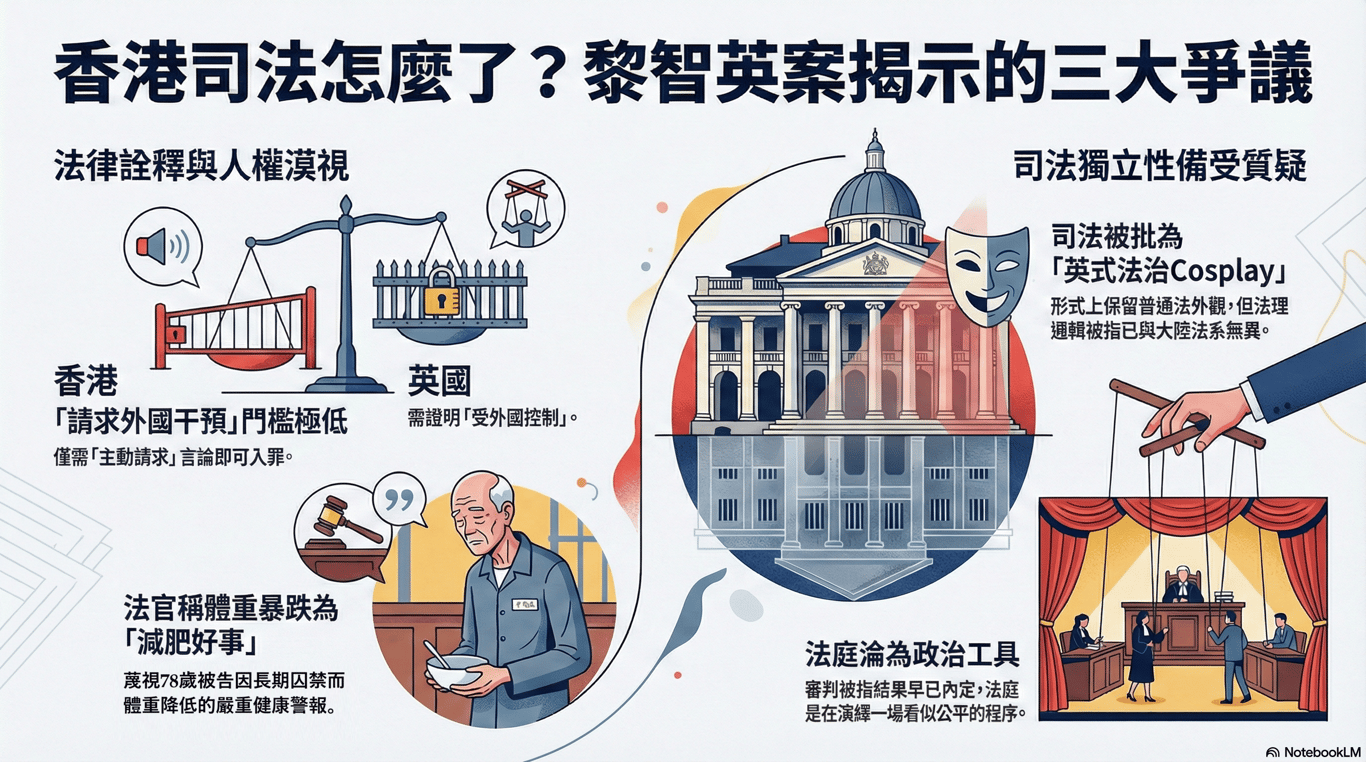 根據提供的來源,香港法官在審理黎智英案時展現出的問題主要集中在法律詮釋的偏差、對被告健康的漠視以及司法獨立性的質疑這三個面向。