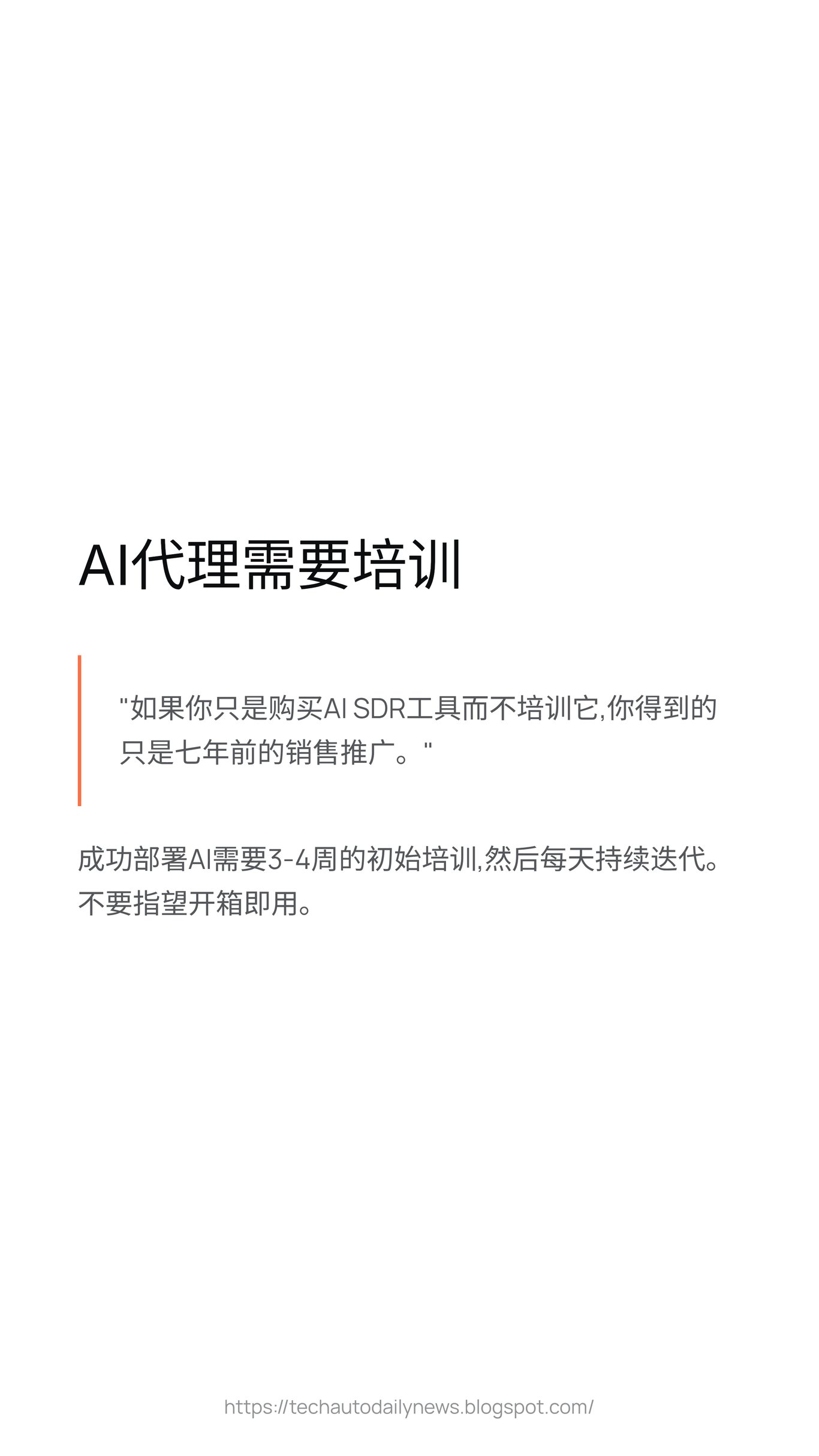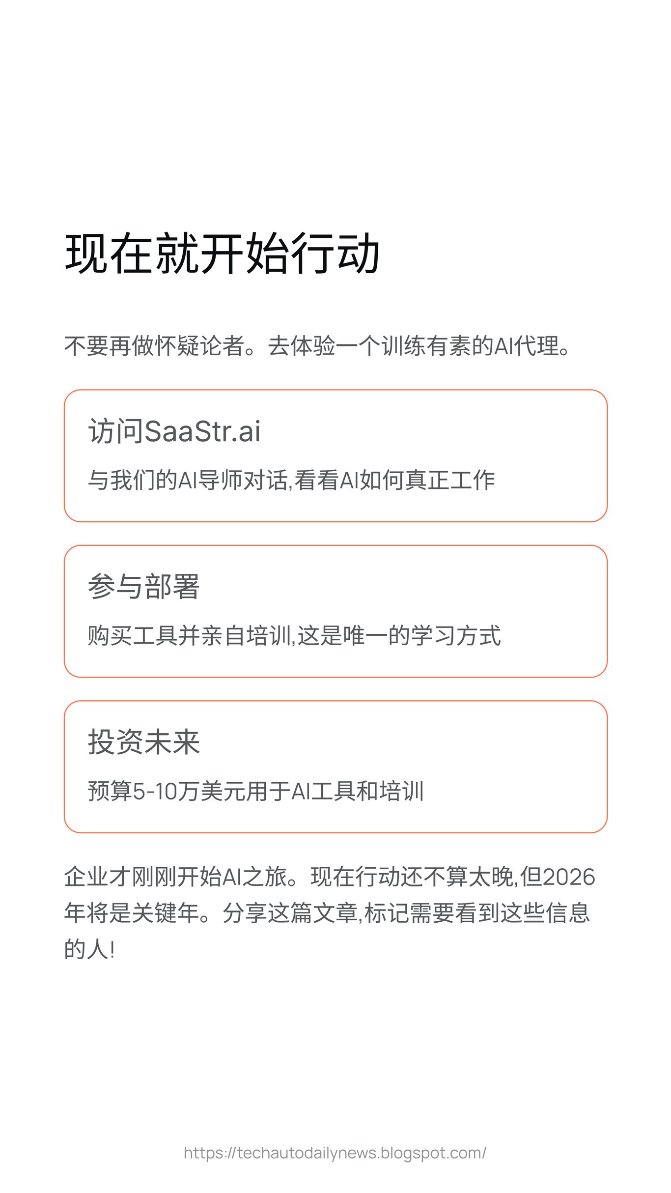 <p>我们正处在一个剧烈变革的时代。AI 代理的全面铺开才刚刚开始,大型企业对 AI 的采纳也仅在起步阶段。对于那些已经拥有满意客户群体的公司来说,现在采取行动也许还为时不晚;但如果你仍在怀疑 AI 的力量,那么最好的验证方式就是亲自去尝试一个训练精良的 AI 产品。</p>