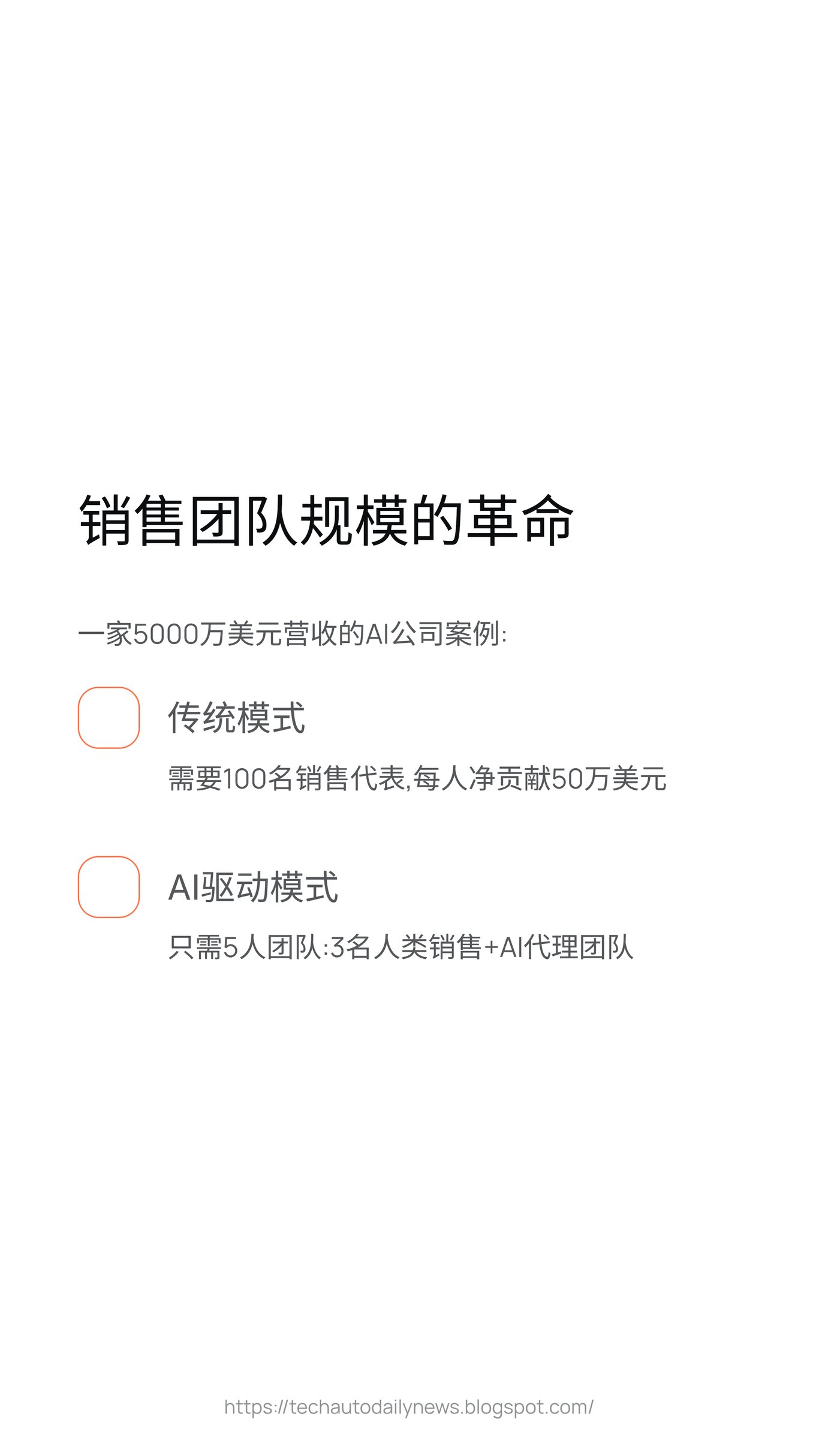 <p>效率的提升直接导致了团队结构的剧变。过去,一家年收入达到 5000 万美元的 SaaS 公司,为了冲击一亿的目标,通常需要维持一支至少百人规模的销售团队。这个模型简单粗暴:每个销售代表(AE)背负 50 万美元的新增业务指标,再考虑到人员流失和培养周期,100 人的团队是实现目标的标配。</p>