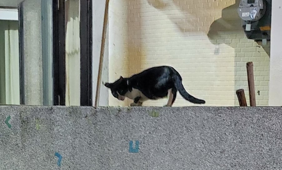 女生看到有人,這才離去,離開後,小虎斑慢慢從對面圍牆陰影處走出來,,灰雜也在附近,拿點心去給小虎斑的同時,花仔從門柱上用只有兩隻前腳下到圍牆的姿勢,開吃那個女生給的食物,看花仔的樣子...,剛剛被嚇得不清....。
