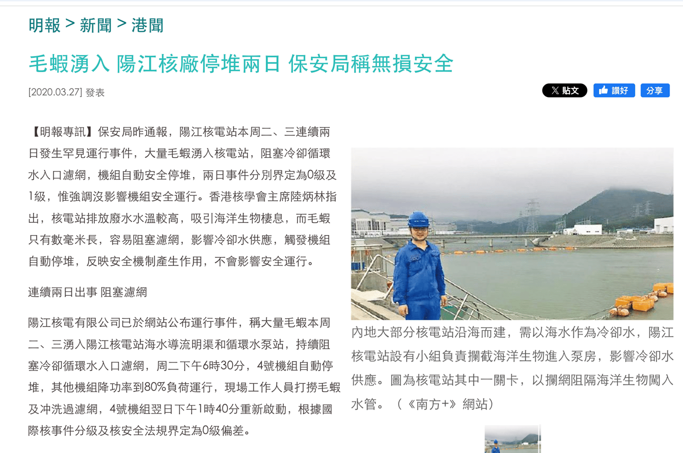 「陽江核電站1級事件 連續兩日大量毛蝦塞冷卻水入口濾網」,2020年3月26日,香港《明報》,news.mingpao.com/ins...陽江核電站1級事件-連續兩日大量毛蝦塞冷卻水入口濾網