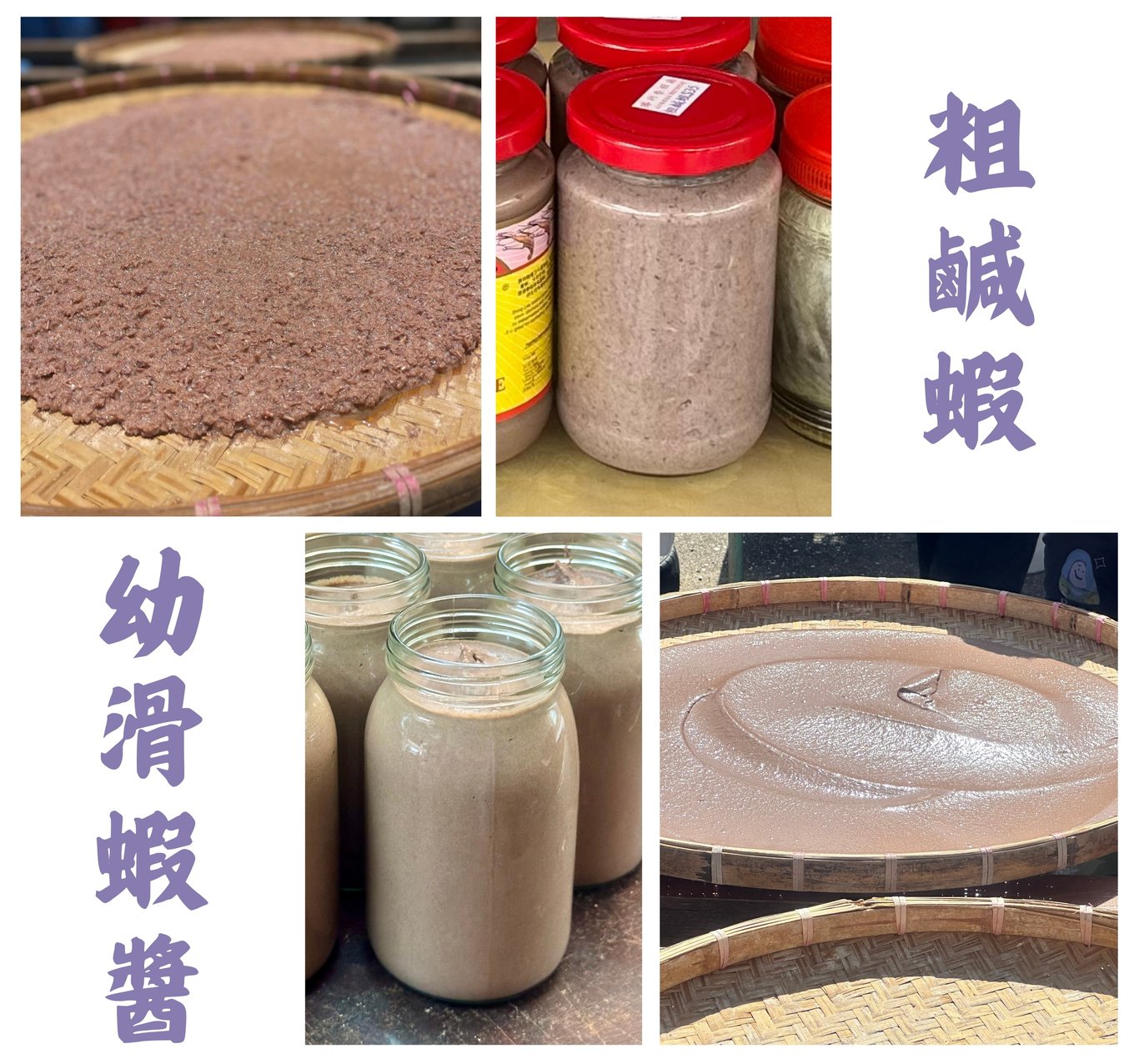圖2-大澳產的粗鹹蝦及幼滑蝦醬:左上圖,窩籃中晾曬的粗鹹蝦,引自香港大澳勝利香蝦廠Facebook Page,另外三圖為作者jeanyim攝於大澳