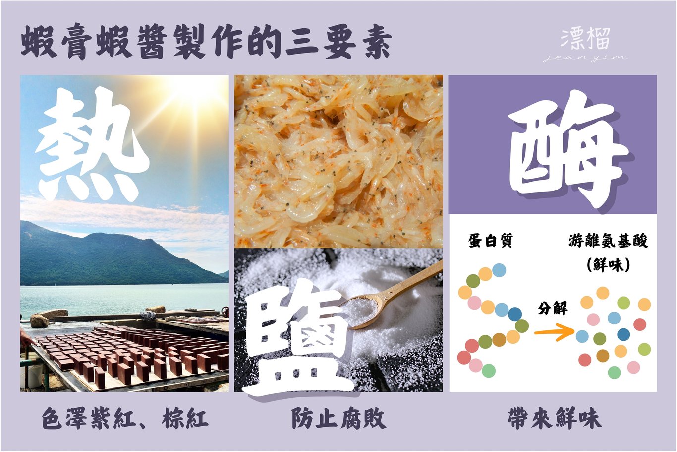 那麼,究竟是什麼,讓細小精緻的銀白毛蝦,轉變為紫灰、棕紅、其貌不揚,卻令人難以忘卻的滋味?原來,製作蝦醬時,會用未經煮製的整蝦,連同內臟一起搗碎,加鹽醃漬,靜候發酵。長時間的陽光曝曬,大自然的熱力帶來色澤轉變,令蝦殼碎片呈現出類似「熟蝦」的紅色;鹽,能夠抑制蝦肉泥中導致腐敗的微生物滋長;而蝦子內臟和肌肉裡自帶的酵素(酶),則能隨著時間的推移,催化蝦肉中的蛋白質轉化爲豐富的游離氨基酸。我們感受到的「鮮味」,其實就是口腔中的味覺感受器在受到氨基酸刺激時,傳達給大腦的訊息。