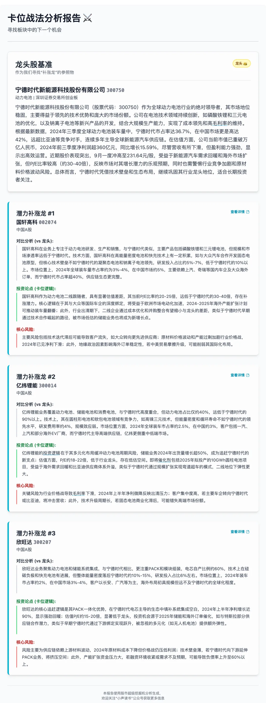 还有就是我个人很喜欢的「卡位战法」的分析报告,以「宁德时代」为例,效果见下图。👇