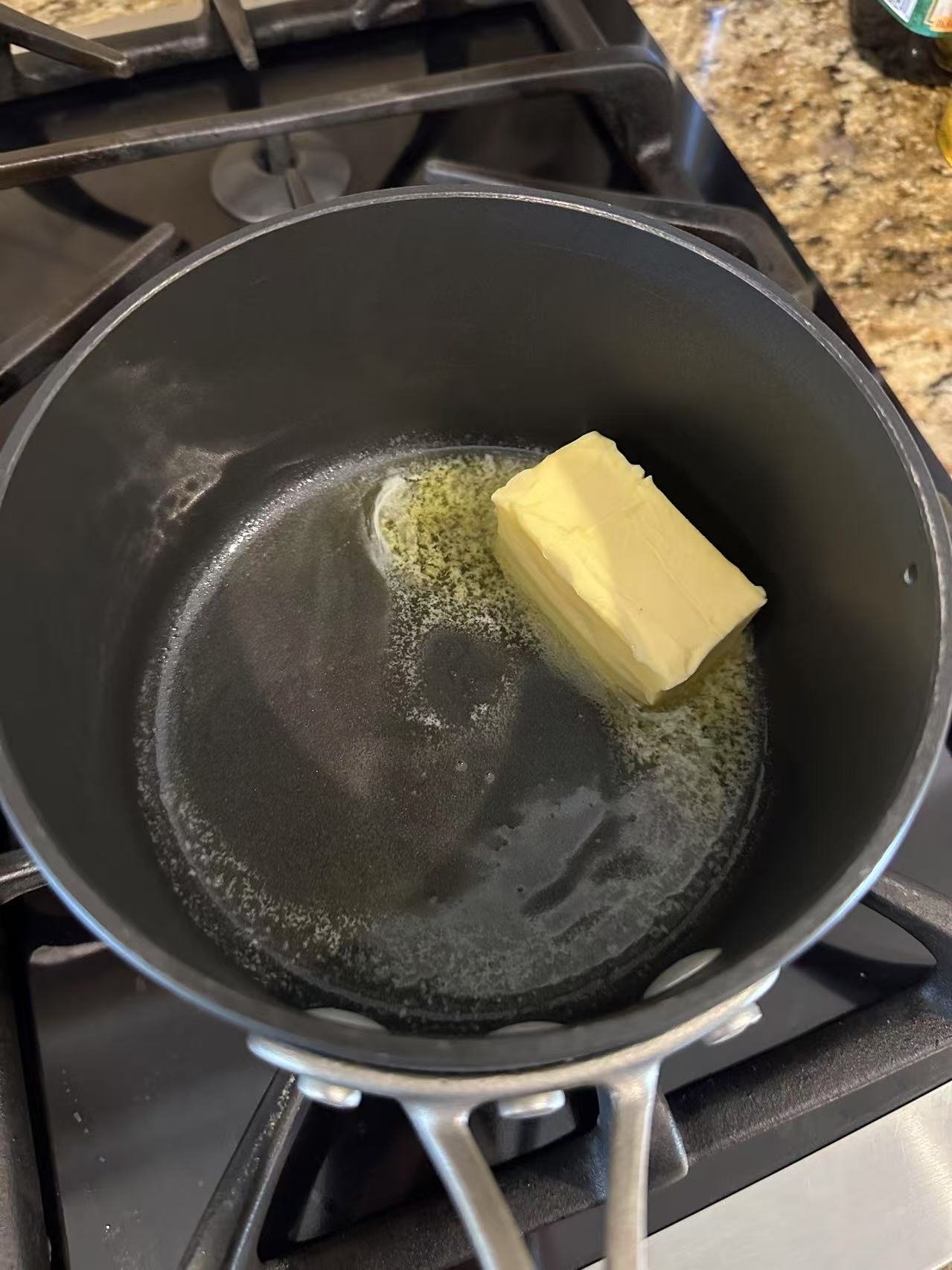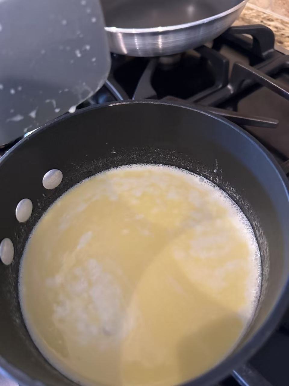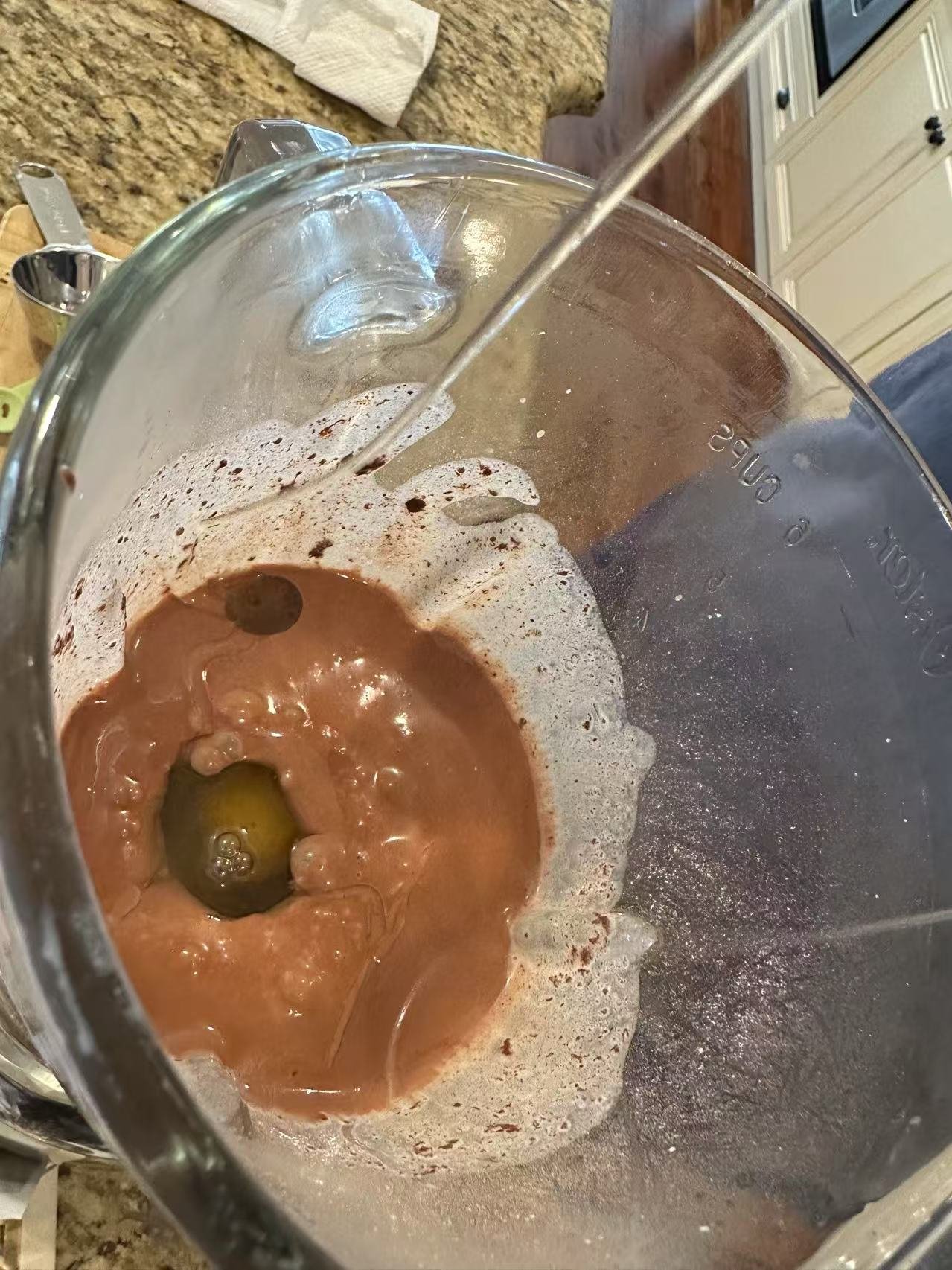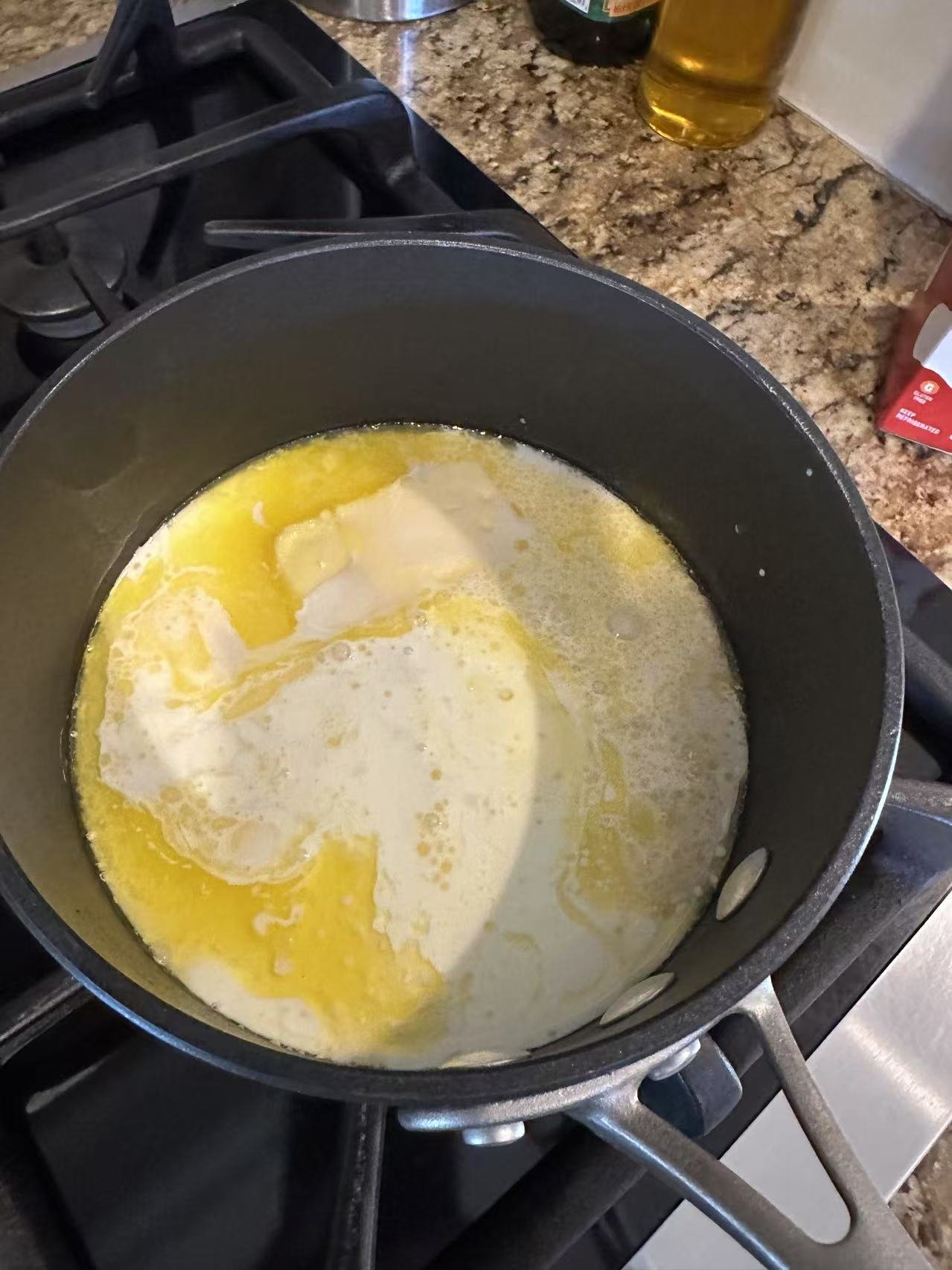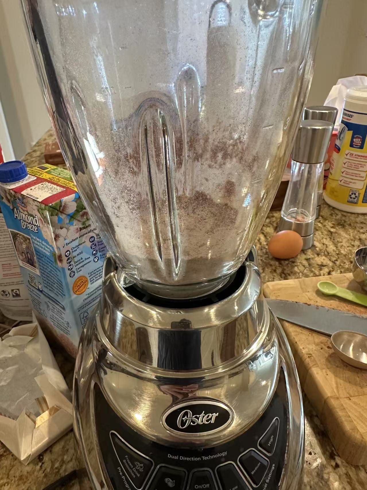 把黄油放入灶台上热融,倒入oat milk一起煮沸了。然后倒入搅拌机中跟之前以及搅拌好的粉再次搅拌,倒入两个鸡蛋。发动搅拌机。搅拌均匀。