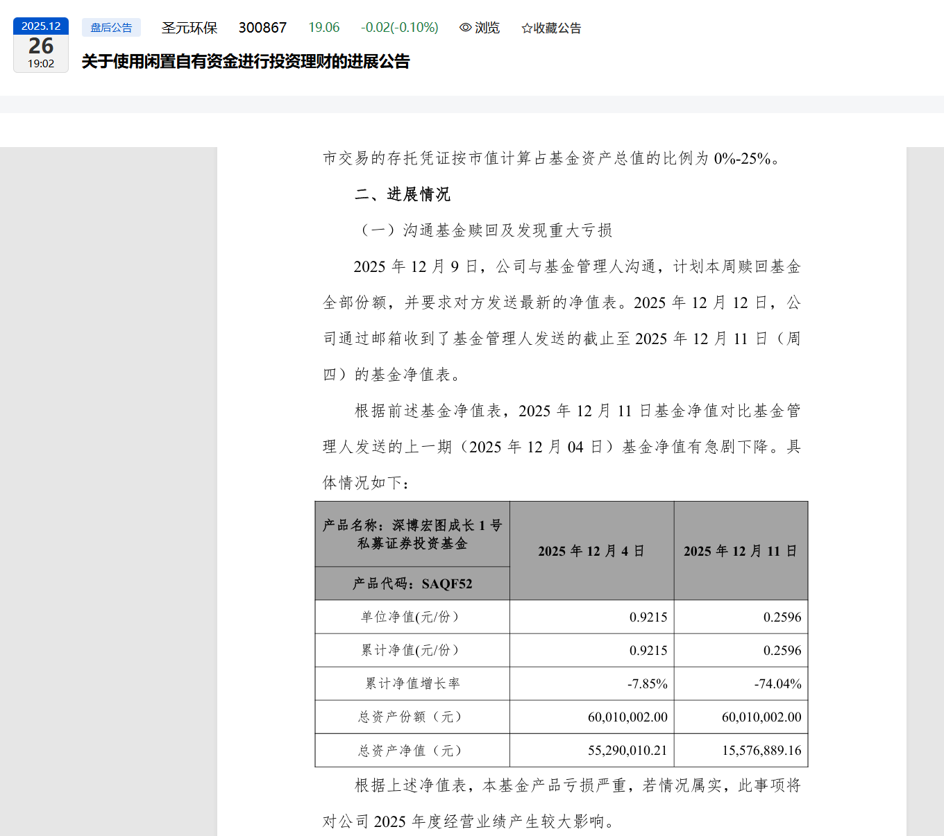 2025年初,圣元环保子公司斥资6000万,认购了“深博宏图成长1号私募证券投资基金”。