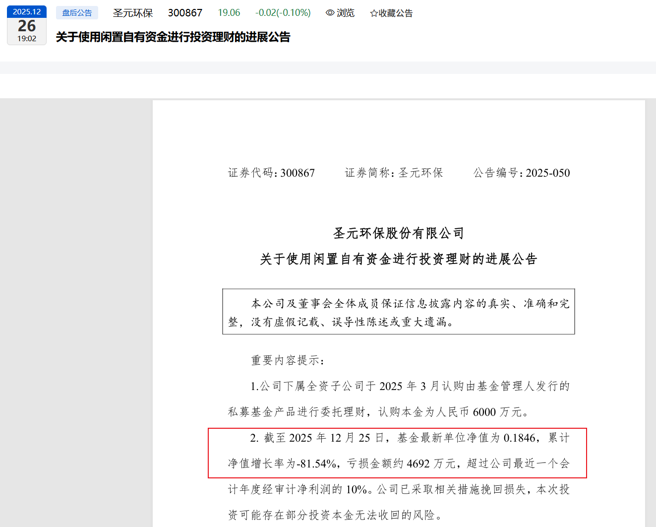 6000万元投资理财巨亏 圣元环保未及时披露被警示——中国经营报