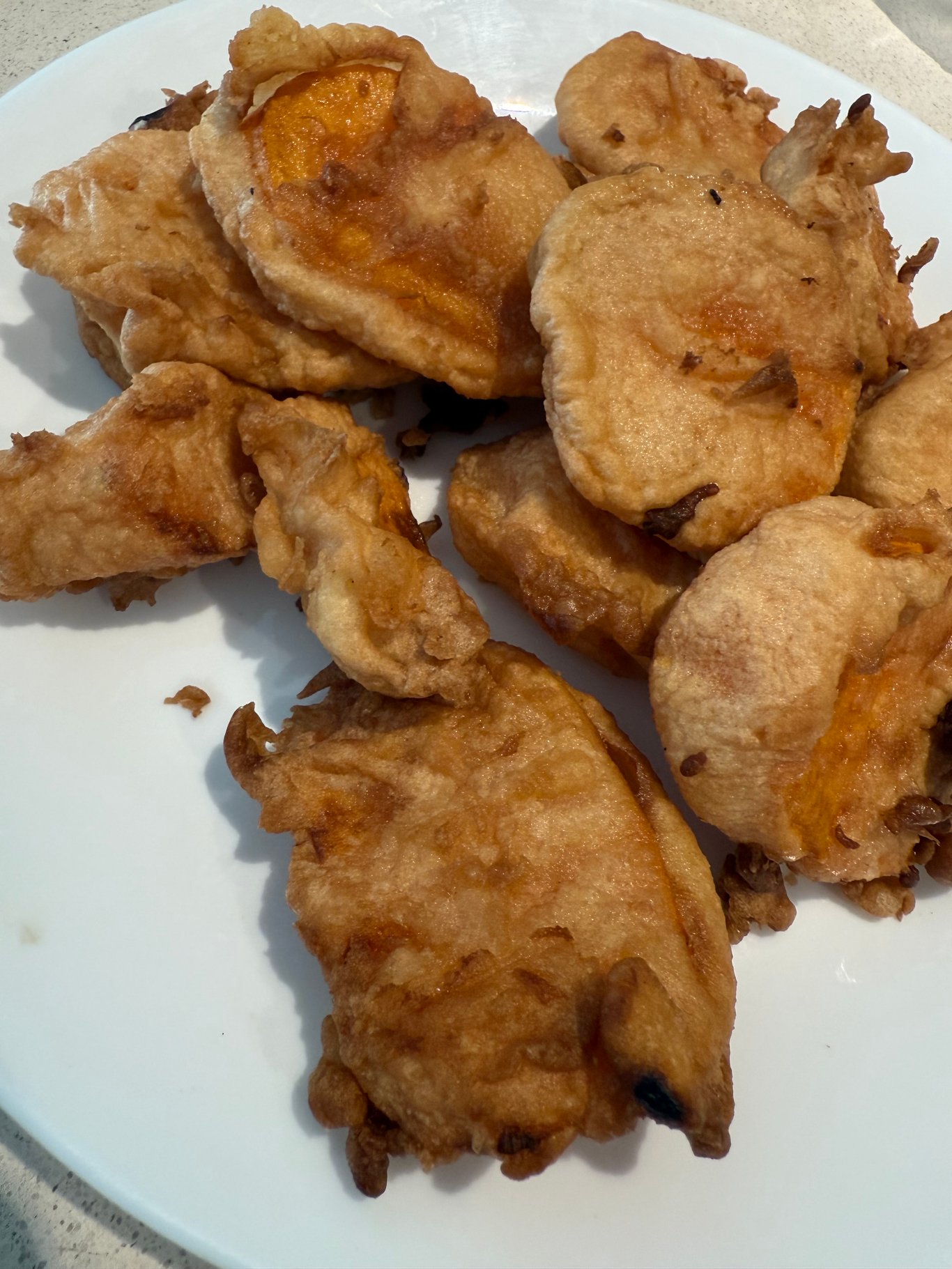 關於她的記憶都是屬於炸,想她的地瓜片,買了幾塊厚厚的地瓜,削皮切成薄片,麵粉加蛋再加上一些水,還有糖,地瓜裹上麵粉漿,準備小小的油鍋,加熱,用手指的水珠試探油熱不熱,開炸。