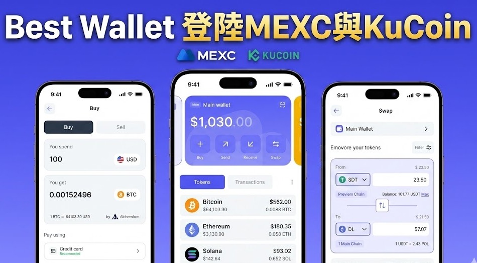 Best Wallet原生代幣$BEST將於11月28日同步登陸MEXC與KuCoin,其中MEXC將在14:00(UTC)上線BEST/USDT交易對,KuCoin亦確認於同日14:00(UTC)開放交易。Best Wallet預售已累計募集約1760萬美元,將在11月28日12:00(UTC)正式結束,目前參與人數超過55000,預估最終突破60000。充值已開放,MEXC的提領功能將於11月29日14:00(UTC)上線。