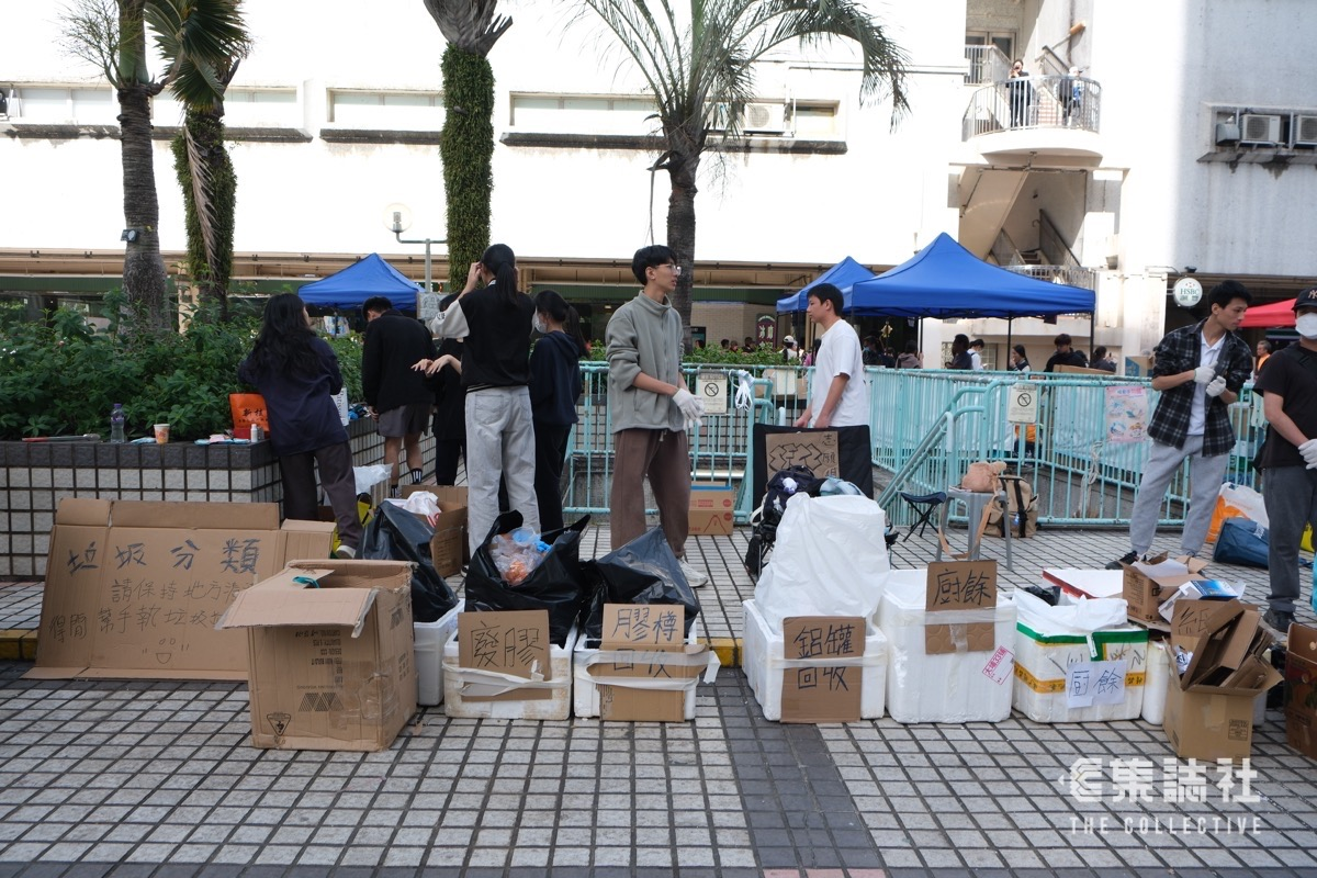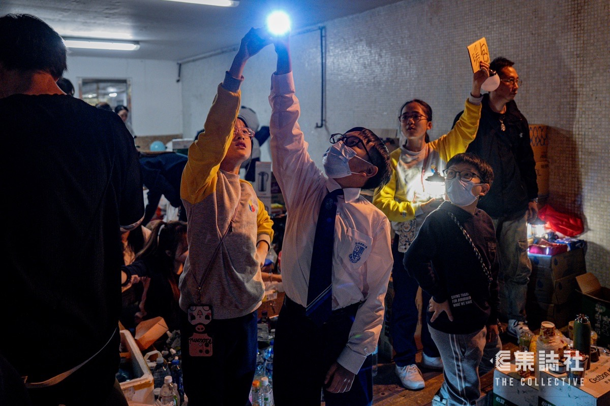 現場也有不少身穿校服的小學生、中學生,在不同崗位駐守。負責派發乾糧的中六生詹同學,於大埔就讀,她說這數天早上主要是班主任課、提供情緒支援,提早放學後,校內約 40 名同學自發到宏福苑一帶庇護中心幫忙。詹同學四出詢問哪裡缺人,搬過狗籠、紙巾,最後留在食品區幫忙。