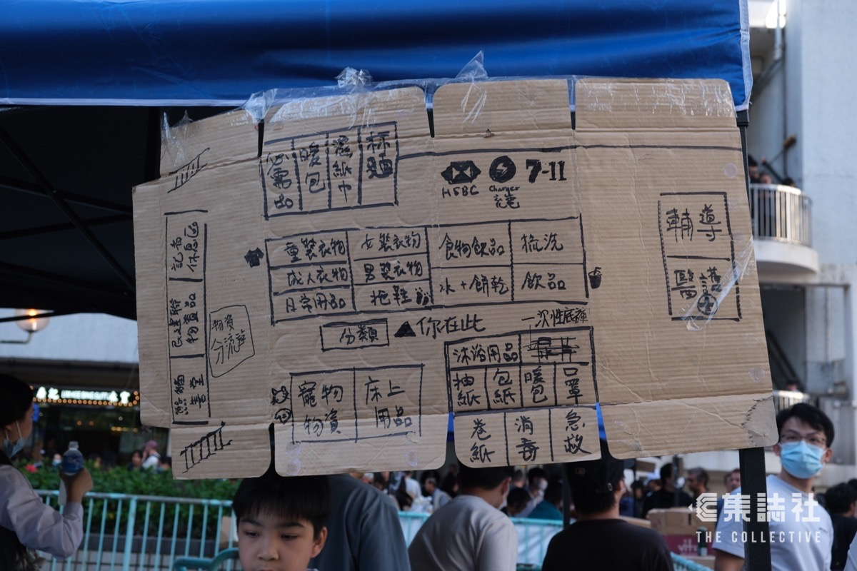不過,源源不絕的物資和人手似乎超出居民需求,周五起,多處標明停收物資、人手足夠,場內亦出現大量「非受災人士勿取物資」的標示。周五晚深夜,義工陸續安排剩餘物資送往慈善團體;至周六中午前,這個由民間自發建成的物資站,再由民間一手一腳執拾、清空,正式告終。