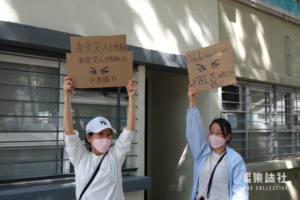 火災第三天開始,現場物資站多了「非受災人士勿取物資,天有眼」等標示,也有人手持相關紙牌於場內遊走和叫喊提醒。葉小姐說,感覺到現場有人混水摸魚,例如問他們住在哪裡,對方會支吾以對。她說無法確認對方身份、亦始終沒有一個身份或責任去進行確認,只望將物資留給真正有需要的人。