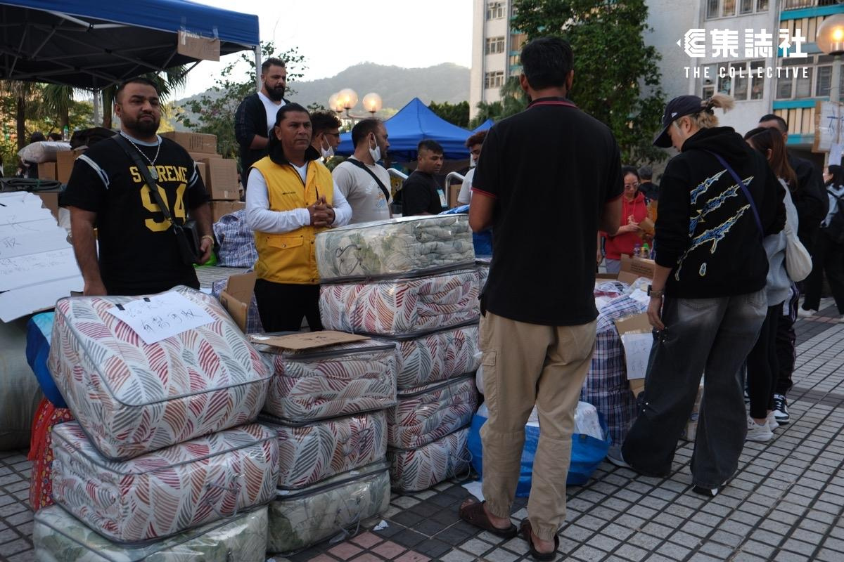 數天以來,持續有市民運送物資到場,包括南亞裔面孔。來自巴基斯坦的阿文、Babar、Simon 等十多位朋友,站在數排簇新棉被後面。他們居於深水埗、元朗等地,分別來港十多至三十年,得悉宏福苑大火後,紛紛自發集資,連續兩晚購買食物、棉被等到場。