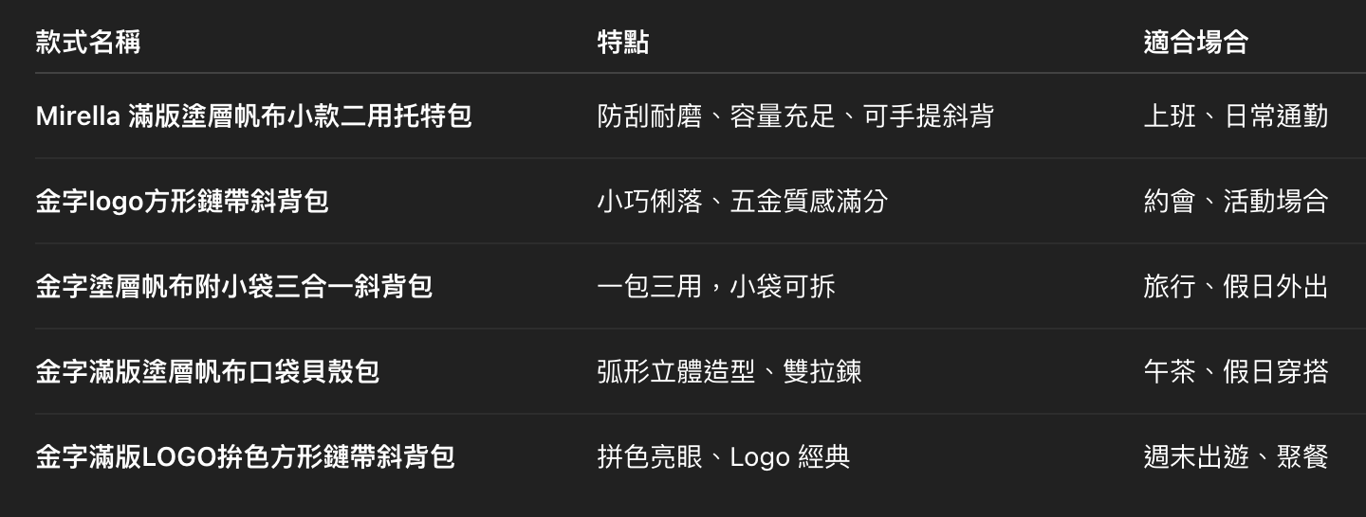 品牌風格以「都會感 × 實用性」為核心,不像其他精品那樣高冷,而是能搭牛仔褲、襯衫、洋裝都OK。