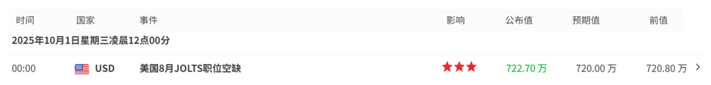 美國JOLTS職位空缺數據顯示,2025年8月底職位空缺小幅回升至723萬個,高於市場預期的720萬個,反映美國勞動市場連續降溫,職缺數增加幅度有限,為聯準會政策提供更多降息依據。