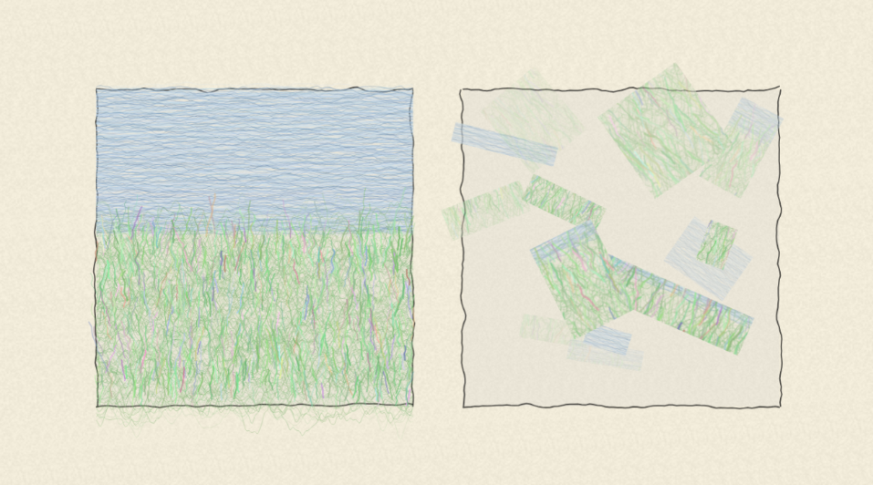 分享一下期末報告的成果 Fragments of Life ,這件作品主要運用課程學到的noise,並且與AI協作增加一些參數讓線條更有變化,很喜歡這種不規則手繪的感覺。這些線條組成河岸的景象,象徵現實的世界。而右邊的方塊則是將左邊的畫面存成一張圖片再進行分割,將這些方塊旋轉並調整透明度放到右邊的正方形中,象徵生活的碎片重組。 目前作品感覺…