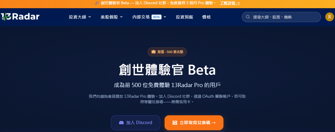 在美股市場中,散戶最常面臨的困境不是缺乏資金,而是「資訊差」。 當巴菲特的波克夏(Berkshire Hathaway)或木頭姐的 ARK 在悄悄調倉時,當公司 CEO 決定在財報前夕大舉加倉時,普通投資者往往要等到股價已經跑了一大截,才在新聞頭條上看到過時的消息。 為了打破這種資訊不對稱,我們創立了 13Radar。我們相信,這些原本躺在 SEC 官網、晦澀難懂的數據,應該被每一位…