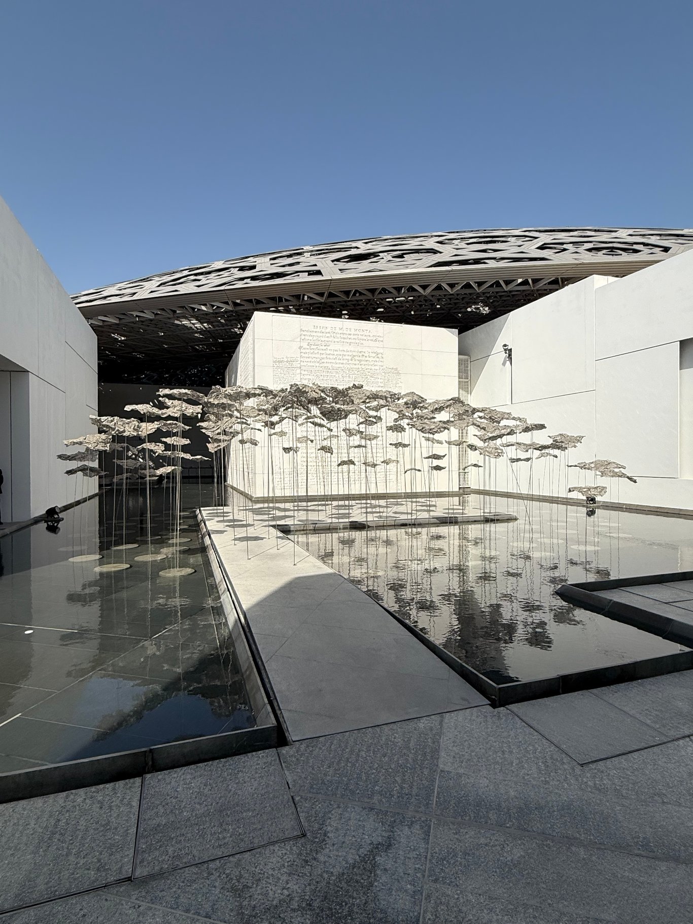 2025.11.9 1. 我們一家三口去了阿布達比羅浮宮。我戴上綠色珠寶項鍊還有銀色貝殼耳環穿著粉紅色洋裝,先生穿著毛衣?女兒穿著紫色洋裝,一路上我說著誰會在中東大熱天穿毛衣?我跟先生互耍嘴皮子。 「羅浮宮裡面都有冷氣,穿毛衣又怎樣!」 我竊笑,心想真是一個蠢貨。 2. 十點前抵達,各國各地的遊客,還有好多穿著華服的中國阿姨們,尊貴的墨…