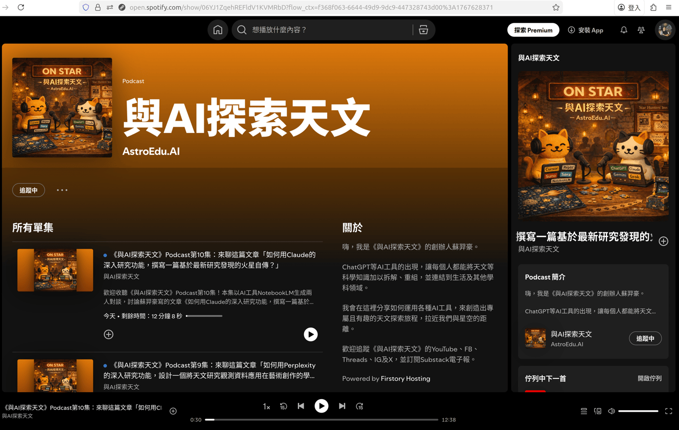 除了之前開設的YouTube頻道外,現在也上架到Spotify、Apple Podcast、Firstory、KKBOX等平台囉~~~歡迎收聽^^ 🔗《與AI探索天文》Podcast上架平台的彙整頁面 open.firstory.me/use...🔗《與AI探索天文》YouTube頻道 www.youtube.com/@ast...