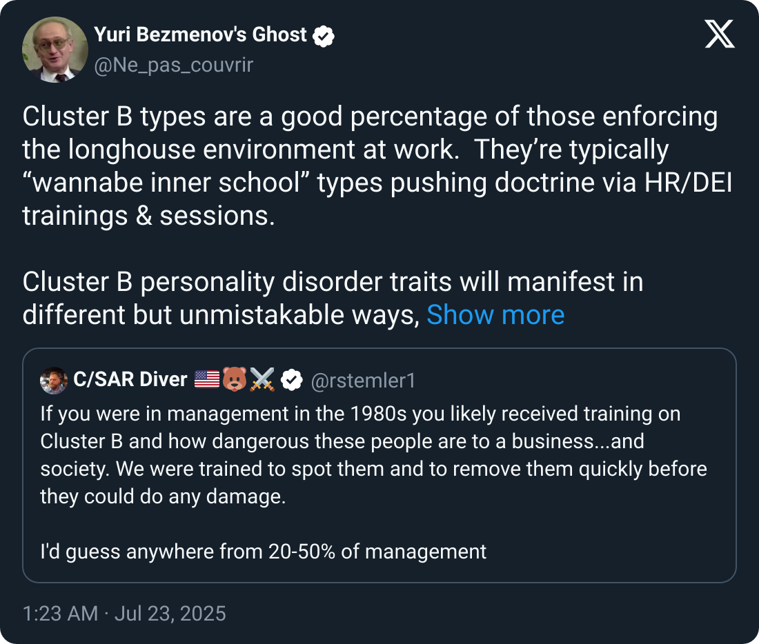 【推文】Yuri Bezmenov's Ghost - Cluster B types are a good percentage of those enforcing the longhouse..