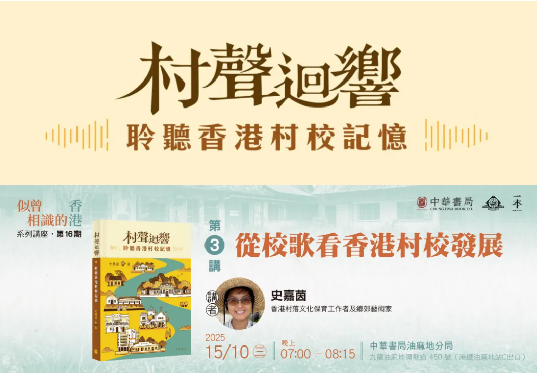 晚間,去油麻地「中華書局」聆聽講座《從校歌看香港村校發展》 在香港,幾乎每間學校都有獨屬於自己的「校歌」,猶如校訓。學生們日常生活里朗朗吟唱的是自己學校的歌曲,在尚未回歸或沒有國歌以前,在更加純樸的年代,校訓、校歌可能是每個學生的“母語”。 坐落於香港鄉村學校(下面簡稱:村校)的校歌歌詞,一般會在開頭描述學校的位置,如茶果嶺四…