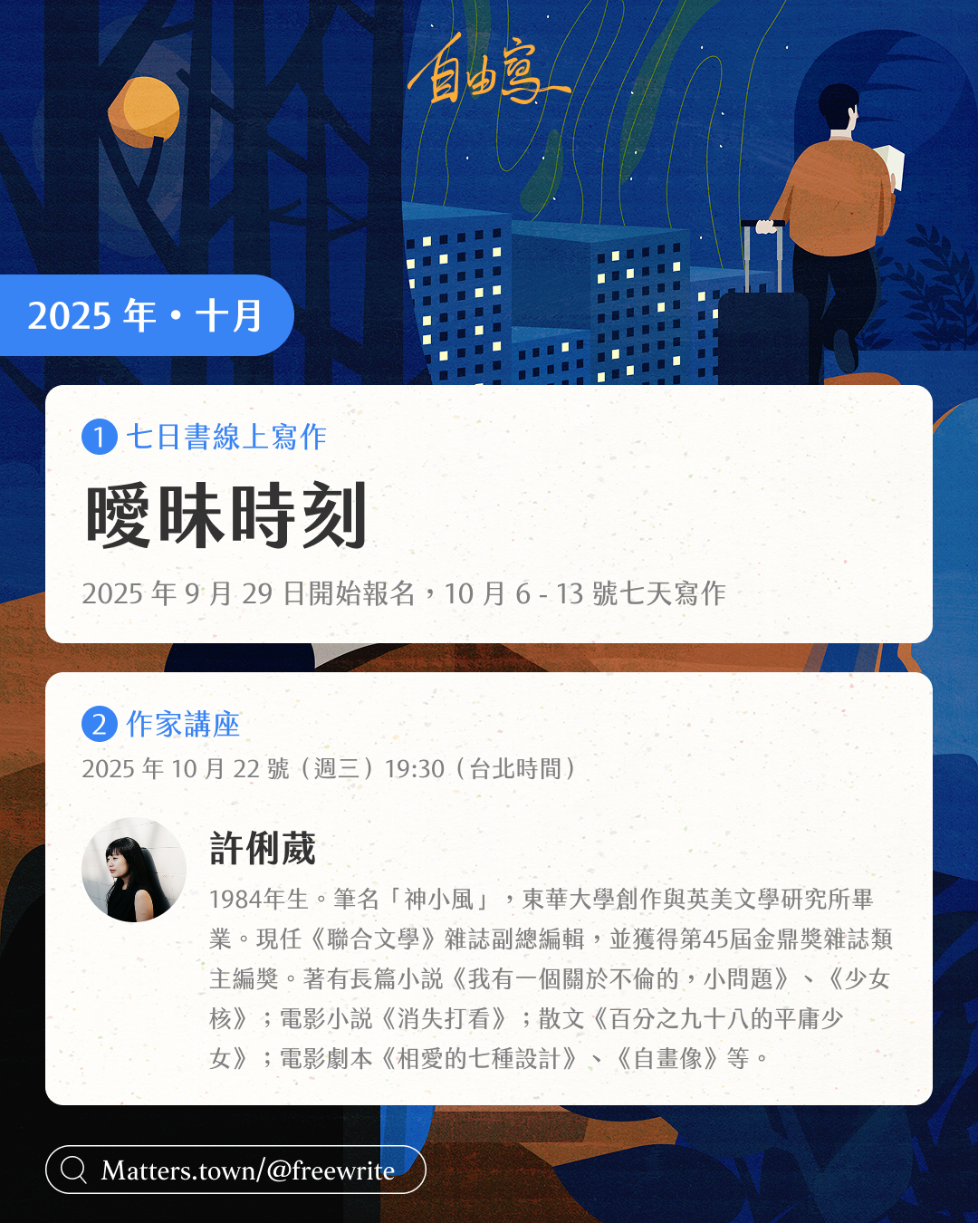 「曖昧時刻」七日書經已結束,今次總共有 95 位文友參與,並歡迎其中第一次參與的 27 位作者。在這個旅程中,大家寫下在不同時期的曖昧時刻,當中包括溫柔、刺激、害羞的故事。10月22日(三)晚上七時半(東八區),台灣作家許俐葳(神小風)將透過作品《我有一個關於不倫的,小問題》,分享小說人物的曖昧、掙扎與矛盾,展開對自身與關係的追問。