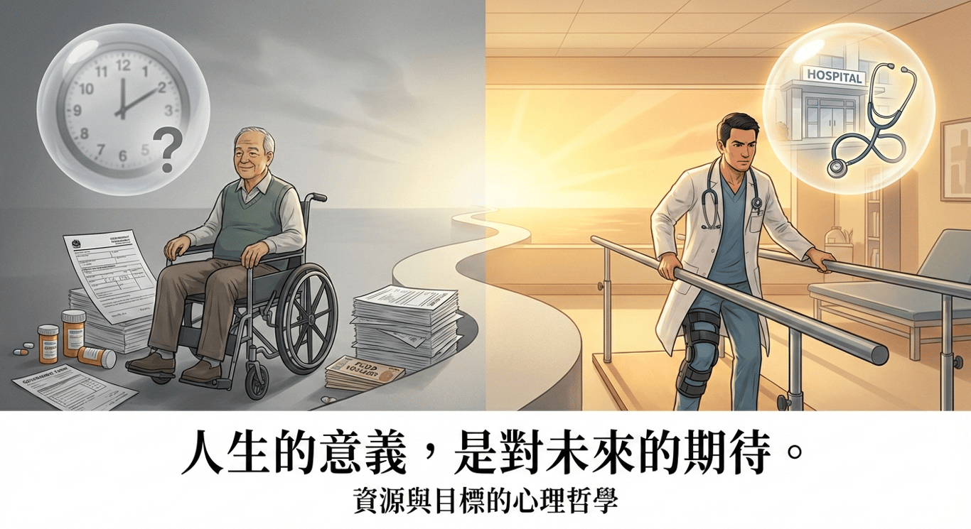 在生活中,我們常常以為心理狀態是由外在條件決定的——有沒有資源、身體好不好、生活方便不方便。但事實上,真正影響我們快樂和滿足感的,是人生的目標和意義。 讓我們用兩個例子來說明。 例子一:依靠制度和資源生活的人 這個人五十來歲,患有小腦萎縮。當我看到他的時候,他坐在輪椅上去復健,但實際上他仍然可以走路,也能開車。然而,他的…
