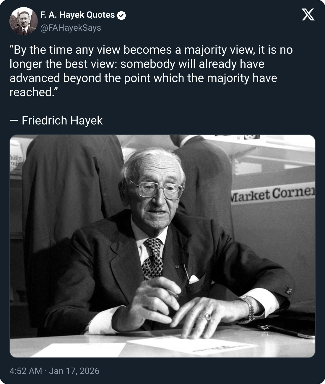 【金句】Friedrich Hayek - By the time any view becomes a majority view, it is no longer the best view...