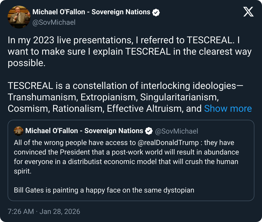 【推文】Michael O'Fallon - TESCREAL is a constellation of interlocking ideologies—Transhumanism...