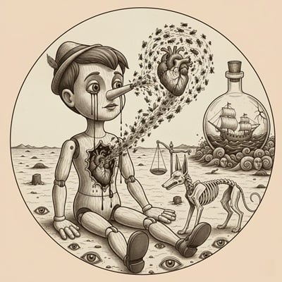 斷了線的皮諾丘只剩肢體軀殼與頭顱 孤獨在舞台上演著沒有劇本的噁心 踟蹰的身影在荒原上留不下足印 抹掉一切才顯現我的名字 塞在瓶中的船是對桅桿的侮辱 血沿著玻璃的傷口被拋進大海 如面容的展開承受無盡黑暗的壓力 無盡頭的自由枷鎖由一無所有開始 遮掩赤裸的軀體在沙漠上尋找方向 胡狼扛著天秤含著羽毛窺視著…