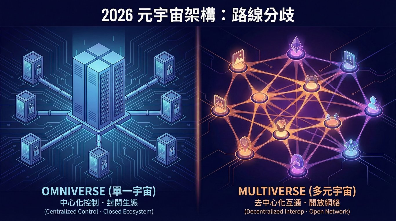 元宇宙終局將是 NVIDIA 式的「數位羅馬」還是 Web3 式的「希臘城邦」?本文作為《2026 趨勢預測》最終章,深入分析決定數位資產歸屬權的路線之爭。從圍牆花園到去中心化,誰能解決「互操作性」難題?揭秘未來衡量元宇宙價值的全新指標。