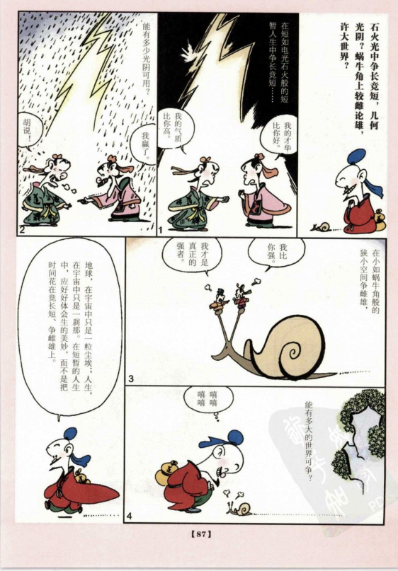 唐代大詩人白居易《對酒》一詩曰:「蝸牛角上爭何事,石火光中寄此身;隨富隨貧且歡樂,不開口笑是痴人。」
